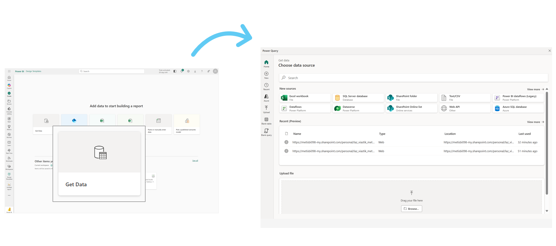 When we select "Get data" now, we are presented with the "modern Power Query 'Get data' experience" (as per the MS Documentation).