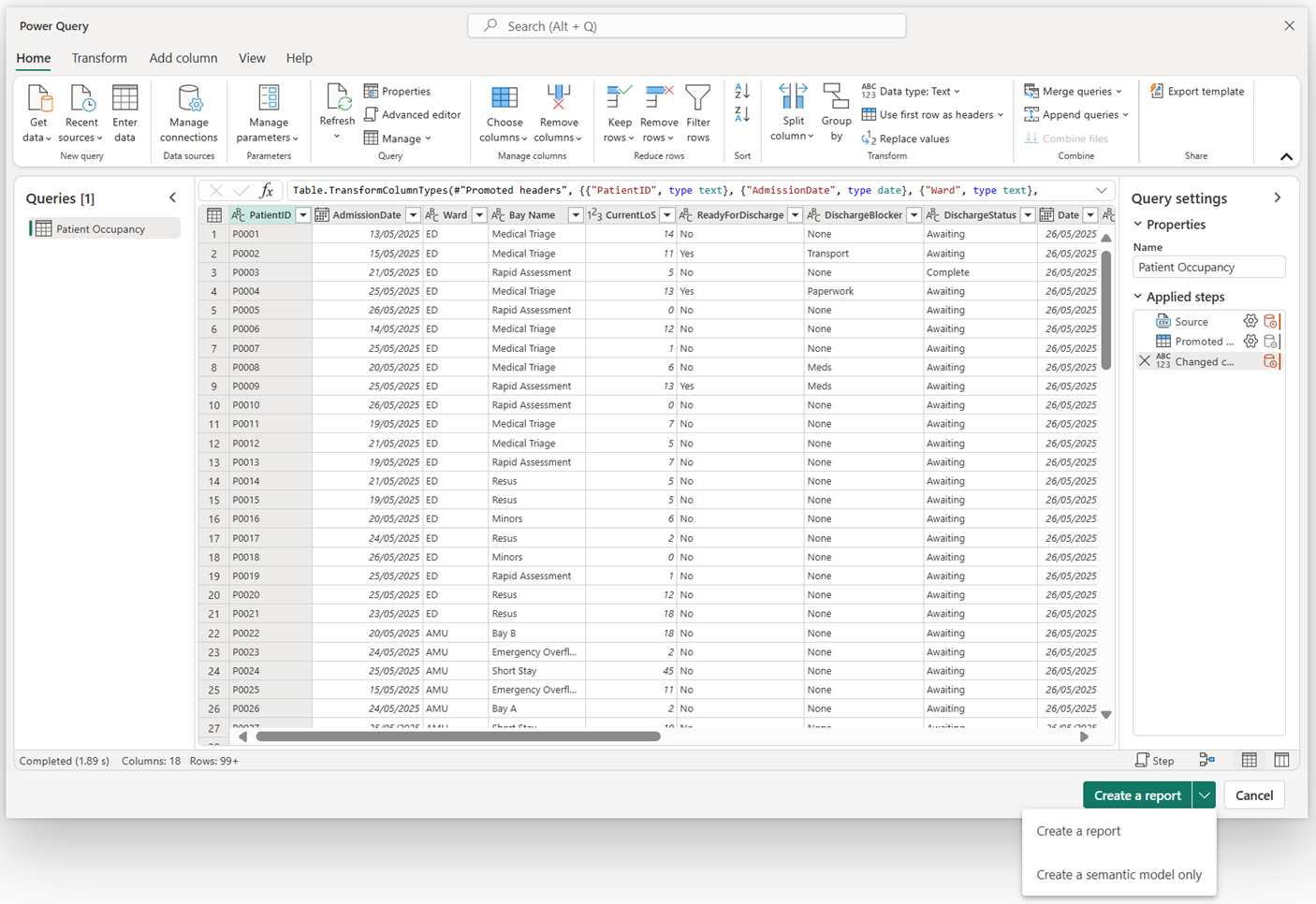 From the above, I selected a CSV file to test this out and below is the result. We now have the same experience in the Power BI Service. We can select "Get data", select the appropriate connector and it will take us to Power Query, it allows us to create a new semantic model from newly ingested data. Before, this was simply not possible in the Service.