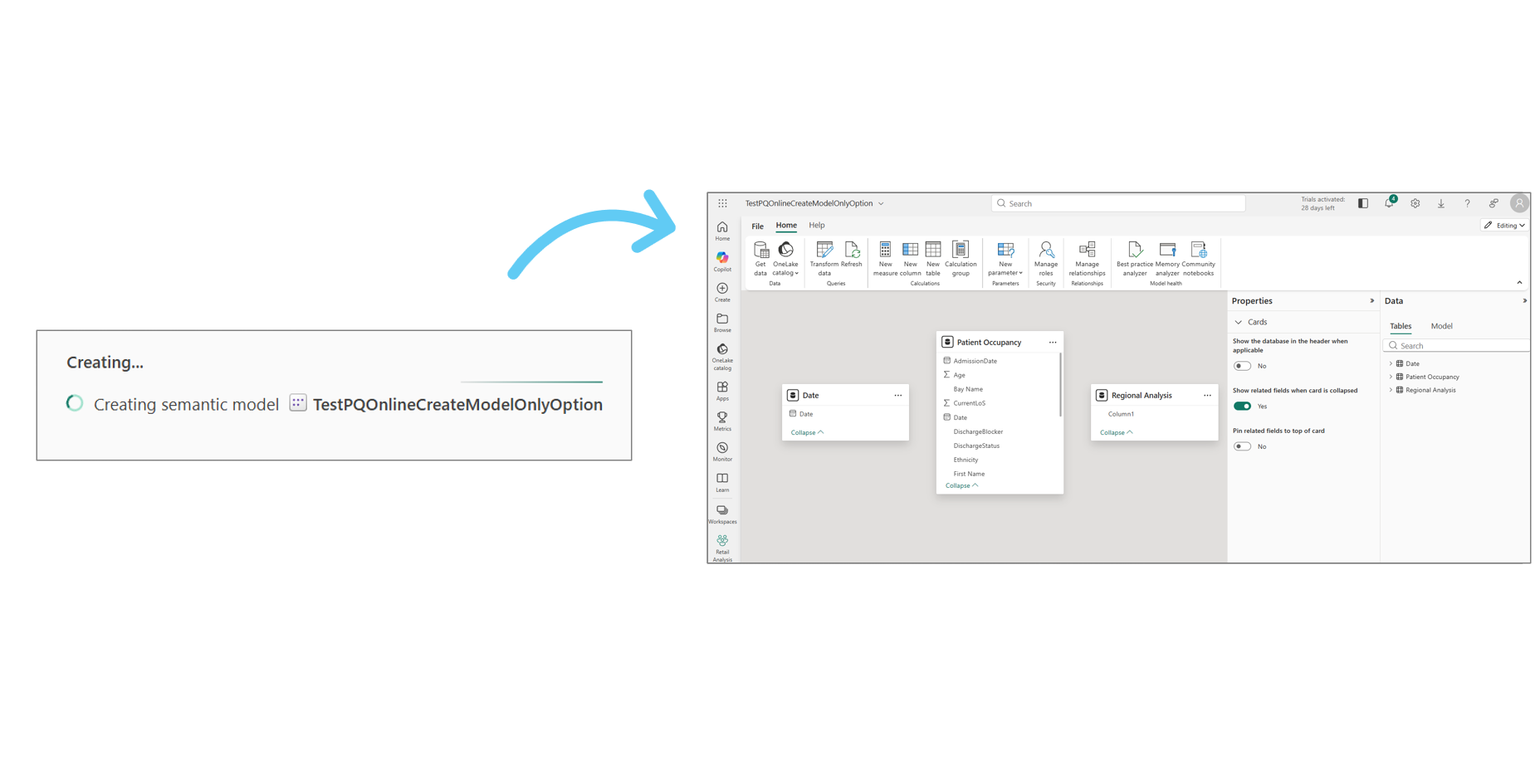 - Auto-create a report: Automatically generates a basic report using key fields from the semantic model.