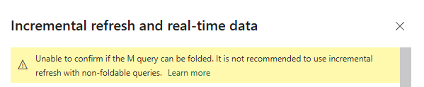 Now, when we go to the incremental refresh policy prompt for configuring it, you may see the warning “Unable to confirm if the M query can be folded. It is not recommended to use incremental refresh with non-foldable queries". This is displayed below: